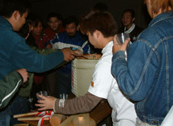 コントロールタワー脇では、恒例の鏡割りが行われ、樽酒が振舞われます。 | ![]() |