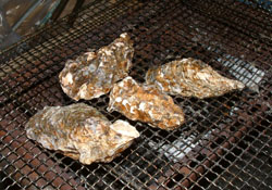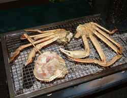 その他のメニューを御紹介致しましょう。まずは、カニです。すでに茹でられていたのを、 こうやってバラしてから炭火でかるく焼きます。 | ![]() |