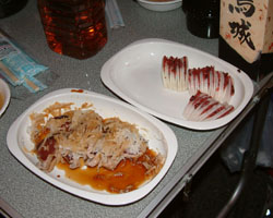 左が鰹のタタキ、大根を細く切ったものがのせられています。 右は、おなじみの大根の梅挟みです。 |