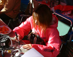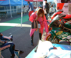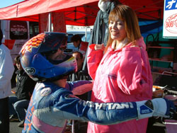予選に向けて、タイヤウォーマーでタイヤを暖めています。 ウォーマーに手を当てて「あったか〜〜い」とChiakiさん。 | ![]() |