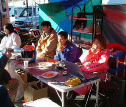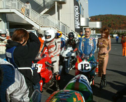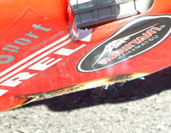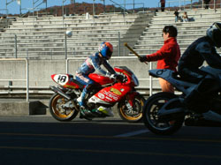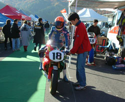 と、テント前でウォームアップをしていたマシンから煙が!! 慌ててエンジンを止めて覗き込むと、アンダーカウルにエキゾーストパイプが当たって、 燃えています。煙が出ているのが、お分かりになりますでしょうか? 「ああ、いいよ」ってことになって、またウォームアップ再開です。い、いいの??? | ![]() |