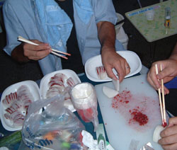 前夜祭の準備が本格的に始まりました。お馴染みの、大根の梅干し挟みです。 これが、おつまみにいいんですよねぇ〜〜。 |