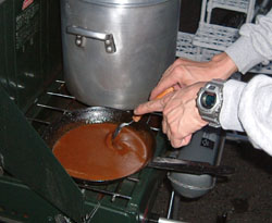 ローストビーフ用のソースを温めています。煮込みに使った野菜は、 シノアでこして、捨ててしまいました。贅沢ですねぇ〜。 | ![]() |