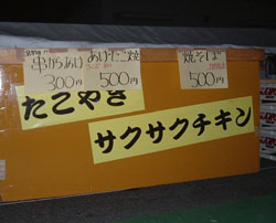ところで。 お向かいの焼きそば屋さんの前面パネルです。この、「サクサクチキン」って何だ??? という疑問が、今日の宿題になりました。「サクサク」って、いったい??? 答えは明日、出るかどうかわかりませんが、追求していきたいと思います! |