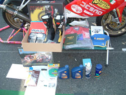 これがその賞品の全貌です。 さらにこの後、ダンロップからハイグリップタイヤを前後希望サイズで頂きました。 アマチュアのレースなので、賞金は出ません、Nanaさん。 |