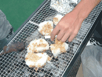 まだまだ食べるものは出てきます。焼きおにぎりをつくってます。 醤油味と味噌味です。形は悪いですが、芳ばしくて、これも美味です! | ![]() |