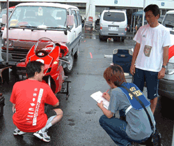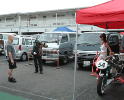 デスモの谷口さんもご自分のマシンの整備中、雑誌の取材を受けています。 |
