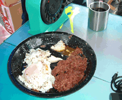 今日の朝食は目玉焼きとコンビーフです。目の前に置かれて、ううん、いい匂いです! |