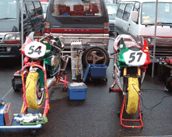 デスモさんのテント内に並ぶトリコロールカラーの2台です。 向かって左がMAKOTOさんのマシン、右はデスモの重森選手のマシンです。 ちなみにこれは予選前のカットです。 |