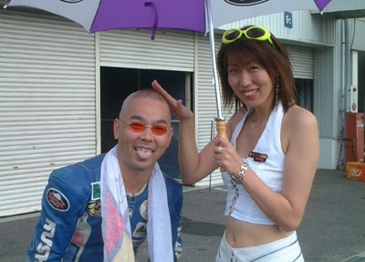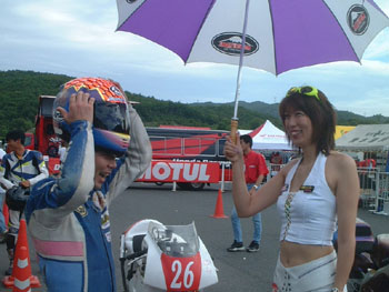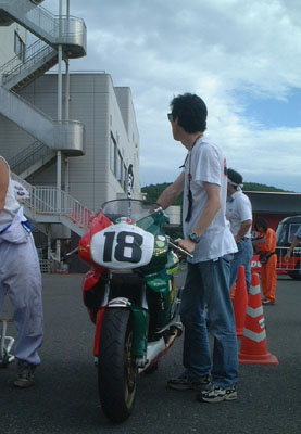 実は既にスタート前チェックが始まっています。ご主人を待つマシンです。 雲も多いですが、夏っぽい空です。 |