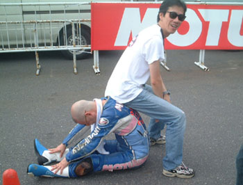 スタート前恒例の、柔軟体操です。このような形で押されていることは、 この時はご当人はご存知ありません。。。 |