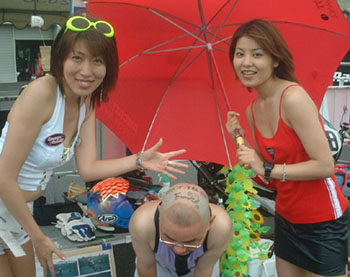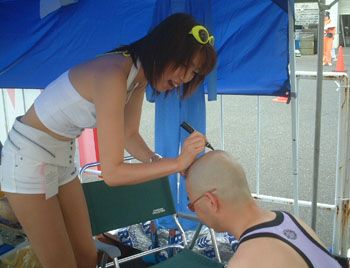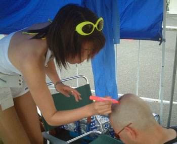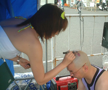 テントで、なにやら始まりました。MAKOTOさんがご自慢の頭部に、 EMIKOさんにメッセージを書いてもらっています。油性マジックですねぇー。 |