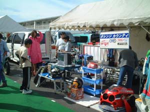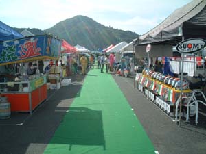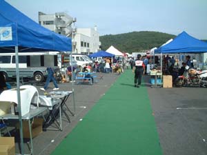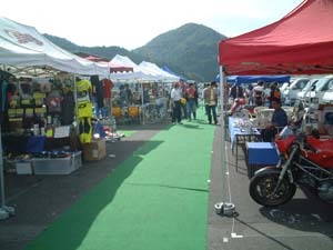 ピット村をご紹介します。ピット裏に、1本の道を挟む形で、 いくつかの出店があります。