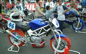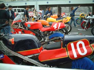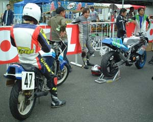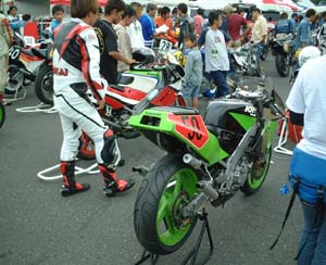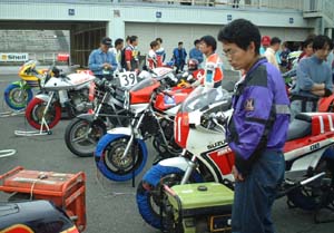 スタート前チェックに並ぶ、 エバーグリーンというクラスに出場するマシンたちです。 懐かしいレーサーレプリカ(と、そうでないの)が並んでいます。 |