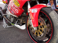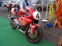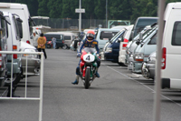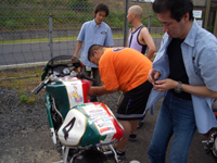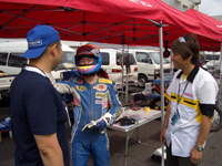 転倒の状況を、身振り手振りで解説するMAKOTOさん。怪我も無いようで、良かったです。 突っ込み過ぎて止まりきれず、コースアウト、転倒したそうです。 | ![]() |