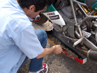 皆で取り付いて作業です。なんでこんな場所でやっているかと言うと、 外したカウルから砂利が落ちるからです。 |