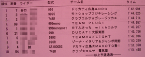 予選結果が出ました。MAKOTOさんは9位です。転倒もあってのことですので、まずまず、でしょうか? 章典外の谷口社長は、なんとトップタイムです。さすが、です。 |
