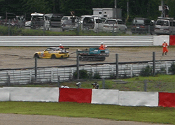オフィシャルにコース脇へと引っ張られて行きます。ここまでかッ、と思いきや、 この後ちゃんとコース復帰しました。しかし、、、(結末は掲示板を。) |