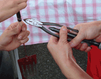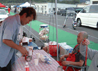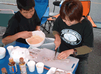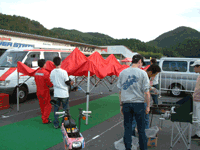 料理用のヘラの柄が取れていたので、割り箸をワイヤーで縛ります。 使っている道具も、サーキットのパドックならではです。 | ![]() |