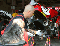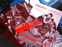 本編でも御紹介しましたドカティのブースでアンケートを記入すると、 ドカティのカタログと携帯ストラップが貰えました。赤地に白で"DUCATI"と入っていて、 なかなかステキです。一番上のカタログのモデルは、カピロッシ選手です。 |