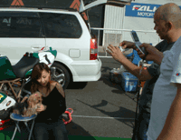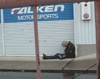 私たちのテントのすぐ裏、タイヤサービスの軒先で寝ちゃっている人を発見! 遠くから来られたのでしょうか?お疲れのようです。 ちなみにこの人、本編にもどこかに登場しています。探してみて下さい! | ![]() |