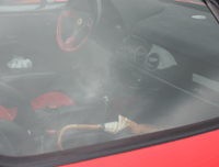 レーシングカーとしか言いようの無いフェラーリF50のコクピットに、婦人用の傘という生活感。 | ![]() |