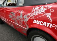 この手のイベントではお馴染みかもしれませんが、このカラーリング。 BMWのボディーに見事なドカのスケルトンです。これ、カッティングシートです。 |