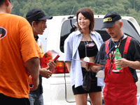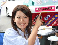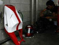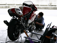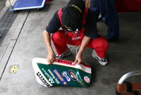 決勝に向け、アンダーカウルにHARUNAステッカーを貼ります。 もちろんMAKOTOさんお手製です。 | ![]() |