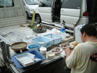 テントもテーブルも無いので、今回のシェフの仕事場は、ここです。 なんか、いつもより広くて快適だったりして。 | ![]() |