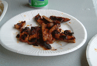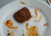 一切れだけ残った、味付き合成肉です。この味がミソで。写真の色から、ご想像下さい。 |
