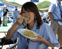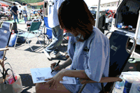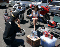決勝レースのスタート前チェックが13時15分から、まだまだ時間があります。 HARUNAさんに、色紙にサインをして頂いています。 | ![]() |