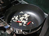 にんにくと鷹の爪をオリーブオイルでソテーします。 | ![]() |