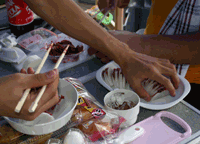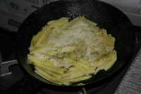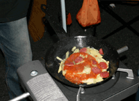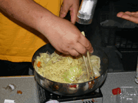 いよいよメインに取り掛かりました! 細切りにされたジャガイモがフライパンで焼かれます。 そこにチーズを載せて、溶かします。 | ![]() |