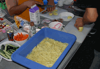 テントでは、本日のメインディッシュの下準備が始まっています。ジャガイモを細切りにします。 |