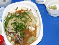 既にちょっと食べちらかされていますが、鰹のタタキです。右上のちょっと緑の物は、 おろしたニンニクです。これがまた、カライ! | ![]() |