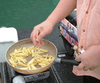 朝食の調理が始まりました。先ほど皮を剥いていたジャガイモを、細切りにして炒めます。 | ![]() |