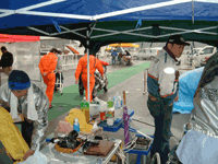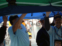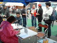 風も強くなり、お向かいのクシタニさんのテントが飛びそうに! 慌ててスタッフの方々が押さえます。 | ![]() |