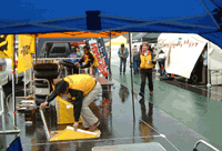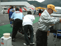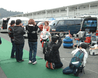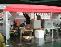 と、雨が降り出しました。急いでマシンをピット内へ移動し、テントの外の物をテントの下、車のハッチ下へ退避します。 | ![]() |
