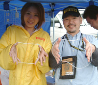 そして出来上がったのがこれ。それぞれのウエスト(?)を持っての記念撮影です。 この細さ! 目の当たりにすると、ただただ驚きです! |