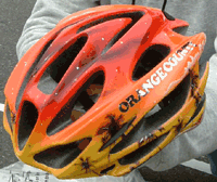 手前味噌で恐縮ですが、筆者の自転車用ヘルメットをMAKOTOさんに塗って頂きました! その贈呈の瞬間です。 | ![]() |