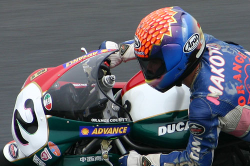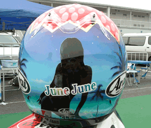 今回のMAKOTOさんの決戦用ヘルメットです。バックにはJuneさんのシルエットです。 結局、決勝では悪天候のため、温存しましたので、幻の決戦用になってしましました。。。 |