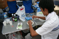 予選と予選の合間、テントではKyoちゃんが何やら練っています。タネは後に、、、 | ![]() |