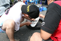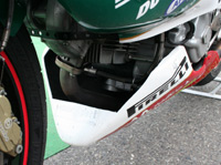 ギコギコと、アンダーカウルを切っています。 先程のレースでストレートの伸びが良く無かったということで、空気の当たる面を増やそうという作戦です。 |