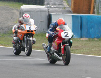 先行する3台を抜いて、根本健選手と並走してフィニッシュするM永選手です。 こちらも、どっちが前だ? |